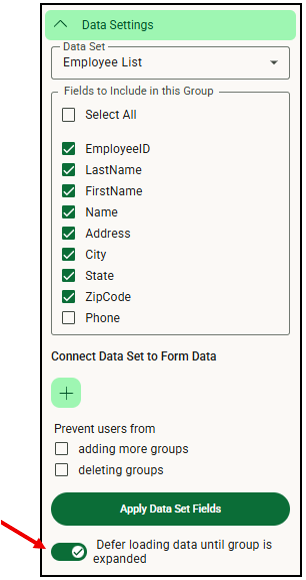 A new Defer loading data until group is expanded toggle has been added to the Repeatable Groups input. When enabled, data sets load only after the app user expands a repeatable group instead of when the form first opens, helping to optimize performance by deferring data loading until it is needed. This enhancement is especially useful for large groups that contain substantial amounts of data.