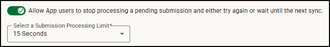 If a submission cannot be completed within the set time limit, the user will receive a message with the option to try again or hold the submission on the device until the next sync. If the submission still cannot be processed after reaching the limit, the same options will be presented to ensure the data is retained and can be submitted once connectivity improves.