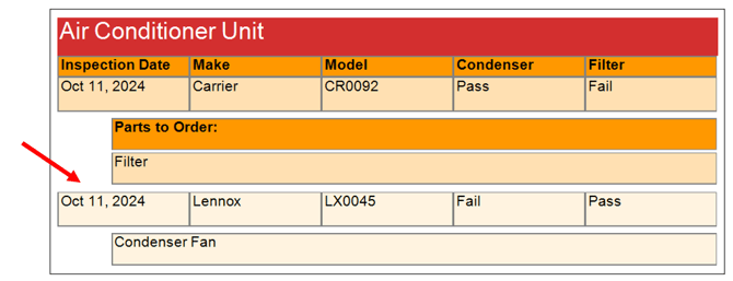 Let's say you have an Air Conditioner Inspection form that is used to inspect air conditioners while on a job. The following explains how to use a dynamic table to easily track this information: