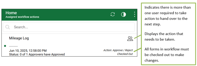 If you're the only person assigned to a workflow step, the form will appear as checked out to you—regardless of whether you're online or offline. If the form is checked out by another user, you can still open and review it but be aware that any changes they're making won’t be visible until the form is submitted and checked back in.