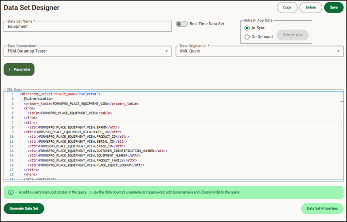 If you're working with IFS FSM or another system that provides data in XML format, you can create a data set using the XML Query data origination type.