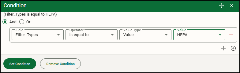 - Select the field on which to build the condition (in this example, Filter_Types). As each option is selected, the statement is formed describing the condition. In this example, Filter_Types, is equal to, Value, and HEPA were selected.