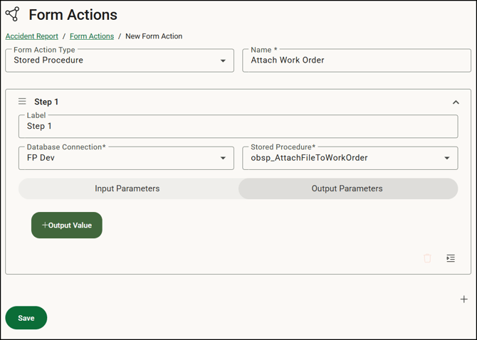 Select None to not assign a mapping which will then remove the parameter from the call to the stored procedure. This is especially useful for parameters that have default values defined when the parameter is not passed. - Click the Output Values tab to specify the form action information retrieved.