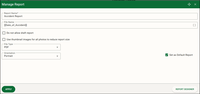 to select fields from your form which inserts the entries from the submission at the end of the file name for help in identifying the report. - Mark the Do not allow draft report option if you do not want app users to print a preview of the report.