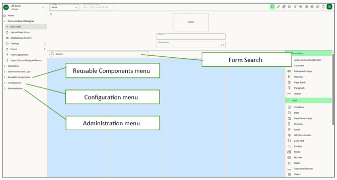 The following illustrations highlight the Administrator site’s menus and options used to manage forms. Menus can be expanded or collapsed to display relevant details, allowing administrators to focus on the information most applicable to their operational needs.