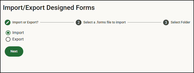 - Click Choose File to select a form file. Only files with the .forms extension can be imported. Any other type will fail. You can import only one file at a time. Click Next.
