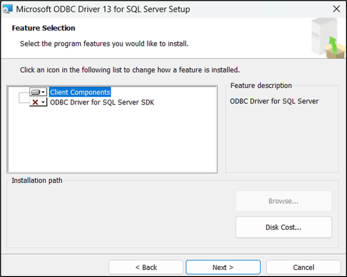 - The Installation Wizard for ODBC Driver 13 for SQL Server window opens.