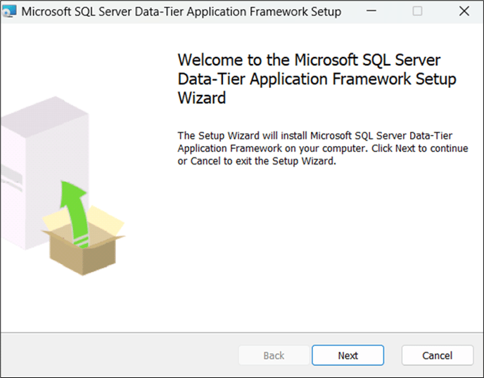 - The Welcome to the Microsoft SQL Server Data-Tier Application Framework Setup Wizard opens.