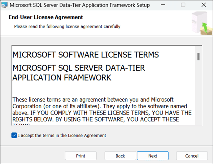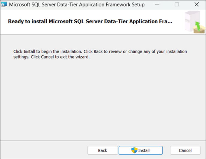 - Accept the license agreement, then click Next. The Ready to Install Microsoft SQL Server Data-Tier Application Framework window opens.