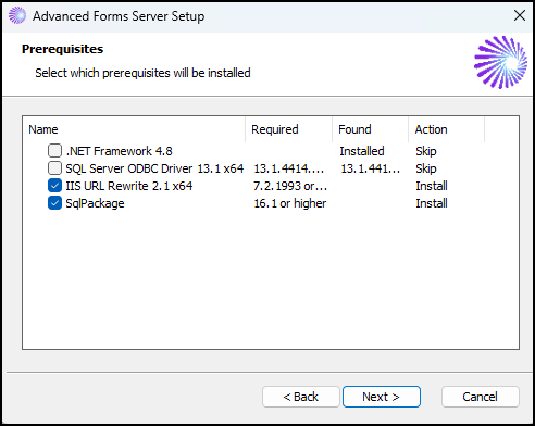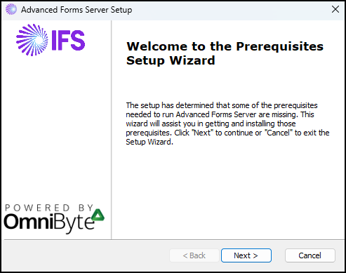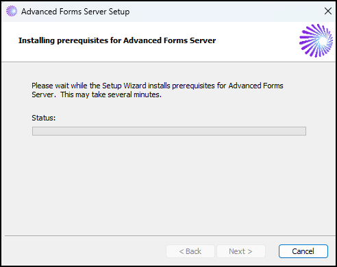 Note: Depending on how your system is set up, the prerequisites listed in this window may vary and are installed accordingly. - Click Next. The Installing prerequisites for Advanced Forms Server window opens.