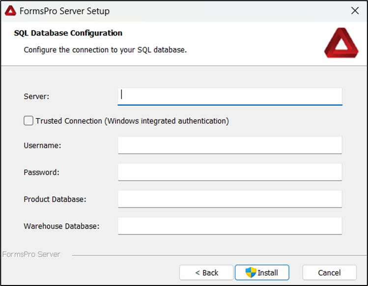- Enter your configuration information, then click Next. The SQL Database Configuration window opens.