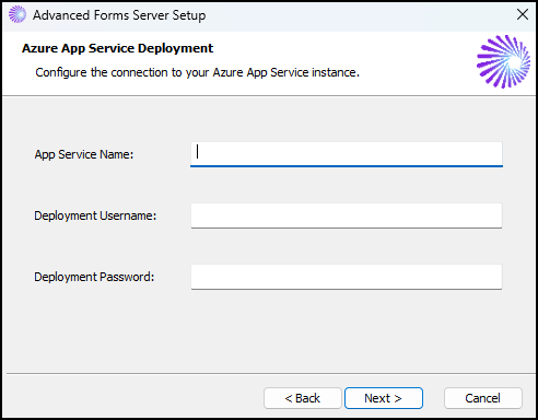 - If you selected Azure App Service, the Azure Service Deployment window opens. If you selected IIS, refer to the previous IIS Installation.