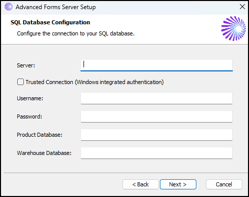 - Enter your configuration information, then click Next. The SQL Database Configuration window opens.
