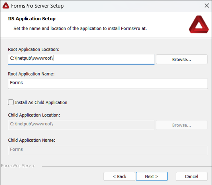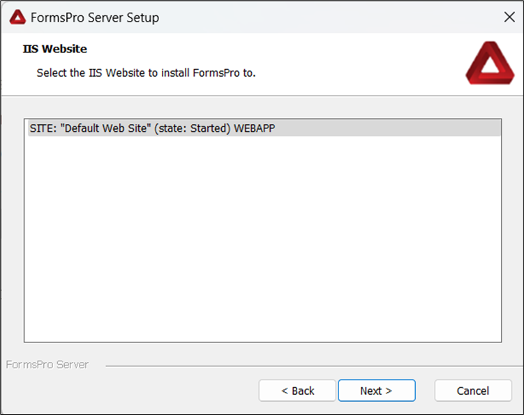 - Select the IIS website to which you want to install FormsPro, then click Next. The IIS Application Setup window opens.