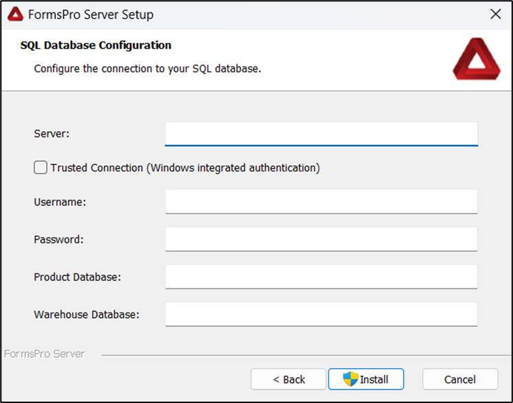 - Enter the location and name of the application at which to install FormsPro, then click Next. The SQL Database Configuration window opens.