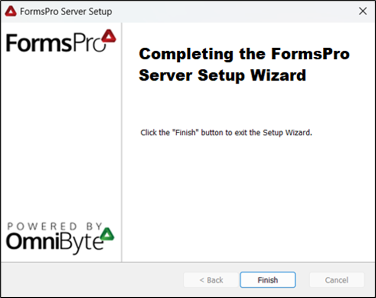 - When FormsPro is done installing the Completing the FormsPro Server Setup Wizard window opens.