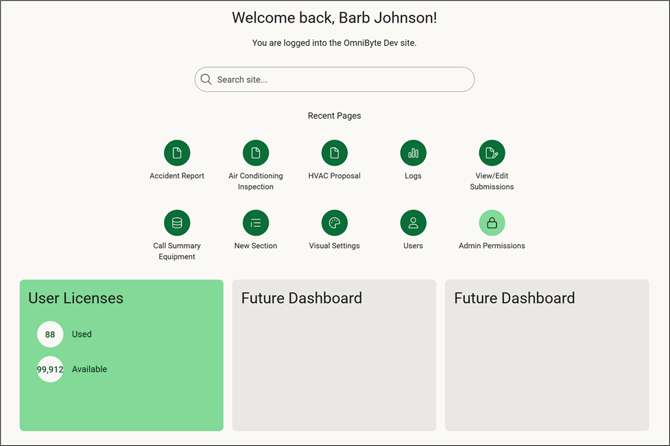 The Home page got an upgrade! You’ll now see your username and to which site you're logged into at the top of the page. In the new dashboard section, you can see how many user licenses are in use and how many are still available. Plus, you’ll notice we have plans for future dashboards, so stay tuned!