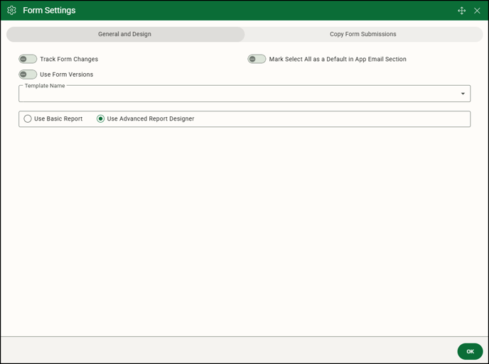(Settings) to open the Form Settings window and select Use Advanced Report Designer.