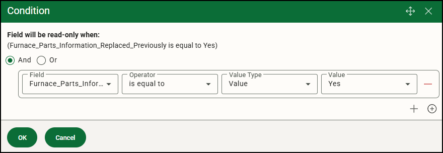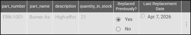 For example, you have a dynamic table on a form for furnace parts. The table includes fields for Part Number, Part Name, Description, Quantity in Stock, and whether the part has been Replaced Previously. You can make the Last Replacement Date cell read-only when the Replaced Previously field is marked “Yes.”