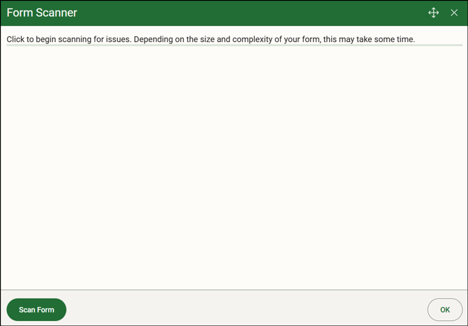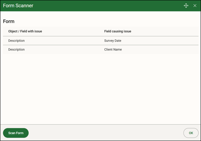 The Form Scanner window lists the errors and issues found on the form and reports that help you resolve the issues before app users do. - Click OK to close the Form Scanner window to correct any errors on a form or report. The issues listed on your scan will remain on the Form Scanner window until you rescan or leave the form so that you can return to the list to check the field or object without waiting. You will also be notified if no issues are found once the scan is complete.