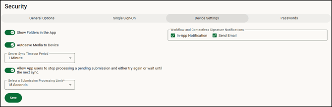 The Device Settings tab on the Security page allows you to set a default timeout period for all devices. Timeout periods can be specified from 30 seconds to 3 minutes, in 30 second increments. Technicians can change the default on each of their devices using the Settings page in the app.