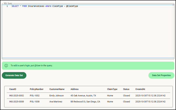 Note: Using the same query on a form both with and without parameters requires two distinct data sets.