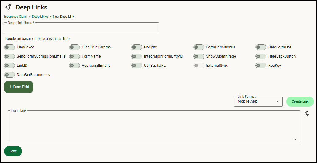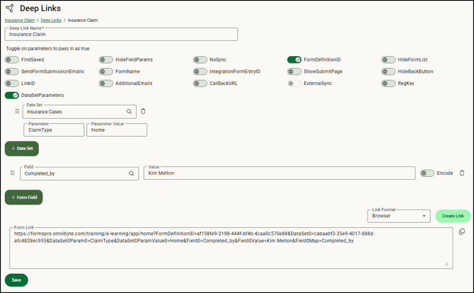 - Click Save. Saving the deep link allows you to make changes later if the form changes or your data in the integrating product changes.