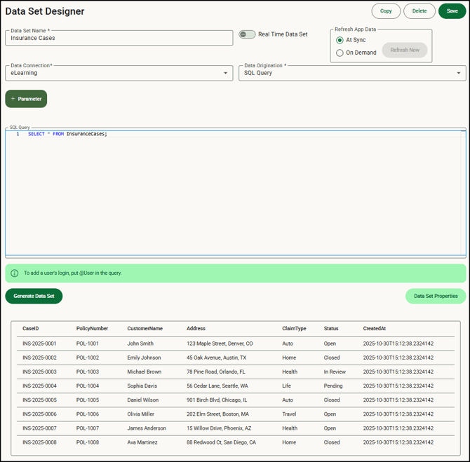 Use the Data Set Designer to configure parameters on a data set. These parameters will match the values sent through the deep link when the form is opened.