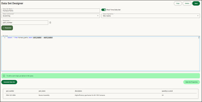 For example, you're using a real-time data set to access your furnace parts inventory. When the form is opened, the data set pulls the current inventory data. If another technician takes a part from inventory, the change is recorded in the external system. Then, when you trigger the same data set, it reflects the updated inventory count—because the data is fetched in real time.