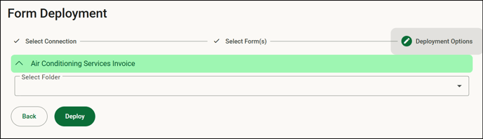 Before deploying, make sure a data connection is set up to the site you're deploying from. Deployments are always done from the site you want the form to end up in. So, if you're moving a form from “Test” to “Production,” you'll initiate the deployment from the “Production” site. On the Form Deployment page, select Deployment Connection as the connection type, and enter the URL of the “Test” site.