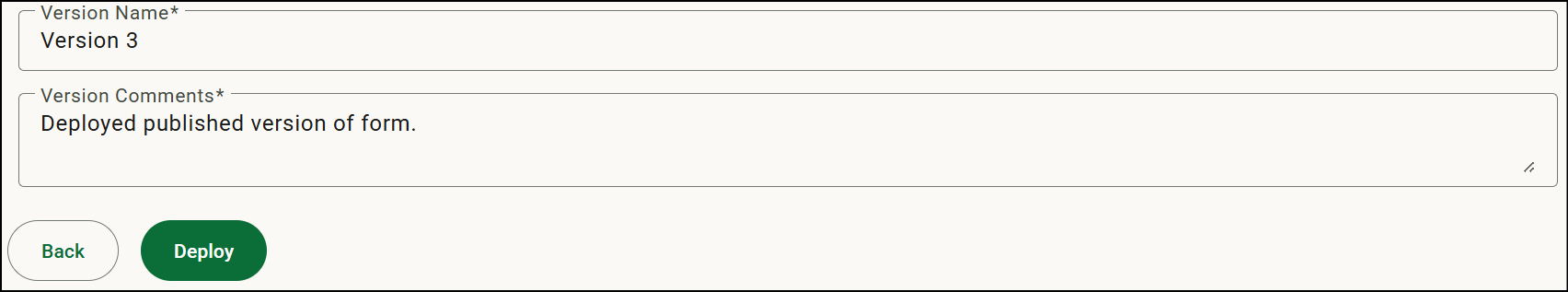 Scenario Action Form does not exist in the deployed to environment. You will be asked to select what folder the form will be in. You will have the option to put the form in the default Forms folder. Form exists in the deployed to environment and does not have versioning enabled. You will have the option to overwrite the form or create a new version. Versioning will turn on if “create a new version” is selected. If the version is selected, enter a version name and version comments. Form being deployed has versioning enabled. The latest version of the form will be deployed, and versioning will be automatically turned off. You can manually turn versioning back on after deployment. Form already exists in environment and versioning is enabled. You’ll be prompted to enter a version name and comments. The version name field will be auto-filled with the next version number. In this case, you won’t have the option to overwrite the existing form. - Click Deploy. A message will appear that the deployment was successful. After a form has been deployed, you can view the deployment in the Deployment Log.