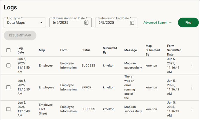Use the Data Maps Log to view the status of form data that has been mapped. This log is useful when troubleshooting a data map that failed to run. You can resubmit data maps from this page.