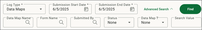 - If you want to filter the data map information further click the Advanced Search collapse button. Additional fields appear allowing you to filter your search by data map name, form name, who submitted the data map, the data map status, the data map type and a search field. Click Find after entering the filter information.