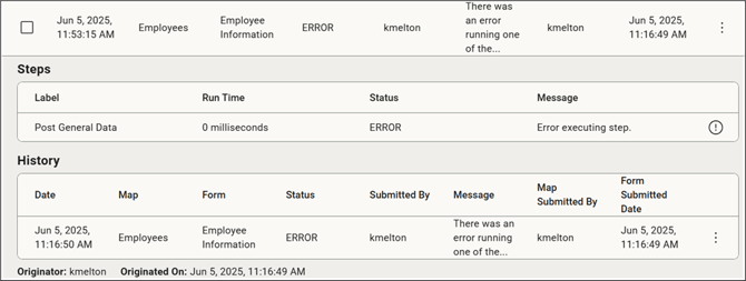 - Information about the data maps is displayed in this log page including the date and time the map was run, the name of the map, the form to which the data map is assigned, if the map ran successfully or errored, the user who submitted the form, the message associated with the map, who originally ran the map and anyone who resubmitted the map, and the date the form was submitted are displayed.