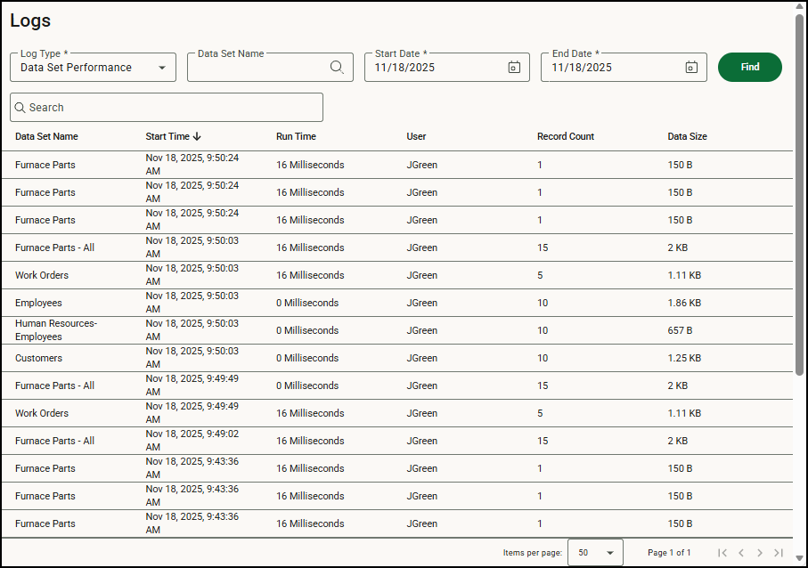 To filter the search, select the data set from the Data Set Name field for which you want to view performance details and enter a start and end date. Then click Find. - Review the results. The log displays key performance details including: