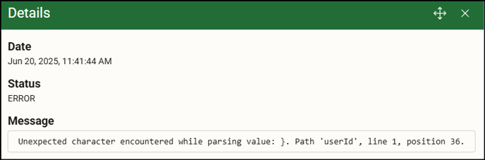icon under the Details menu. The Details window opens and displays detailed information about the error.