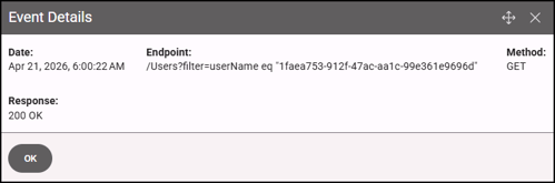 Use the SCIM log as a primary tool for diagnosing and resolving synchronization issues. Each log entry provides key details, including the timestamp of the request, the endpoint that was called, the HTTP verb used (such as GET, POST, PUT, or DELETE), and the system’s response. Together, this information helps you trace the sequence of events, identify failures, and understand how the system is interacting with the SCIM service.