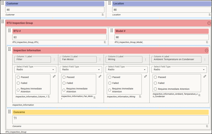 Let’s say you have an inspection form for roof top units. Each customer’s rooftop has a different number of units on it. Your form can contain a repeatable group for all the information a tech needs to inspect for each unit. During the inspection, the tech simply clicks an add button as they move to the next unit to inspect until they’ve completed as many as they need to for that customer. For the next customer, they’d complete the same form with a different number of repeated groups.