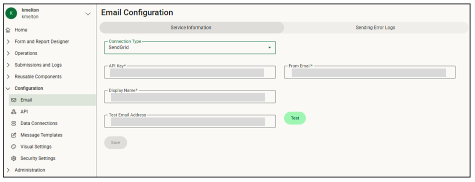Use the Email Configuration page to set up your email settings with SendGrid, a cloud-based service that enables scalable email delivery. It is highly recommended that this setup be completed by your IT department or system administrator to ensure security, proper configuration, and compliance with your organization’s email policies.